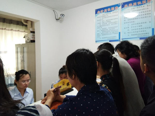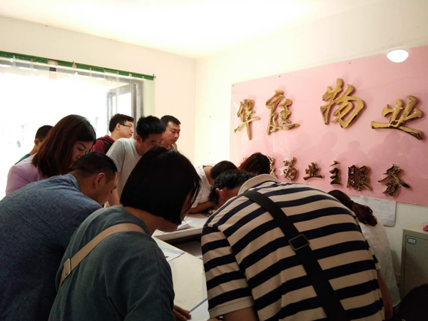 經(jīng)過各部門領(lǐng)導(dǎo)的精心帶領(lǐng)下及各單位同事的幫忙努力下一天的工作終于落幕,順利收房82戶。(圖為前臺(tái)收房及收費(fèi)室) 石婷